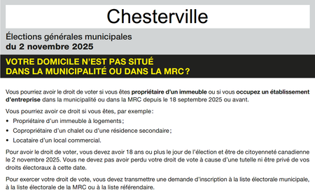 La période de candidatures est du 19 septembre 2025 au 3 octobre 2025 jusqu'à 16h 30. Le formulaire de déclaration de candidature est disponible au bureau municipal sur les heures d'ouvertures, qui sont les suivantes: Cliquez sur ce lien