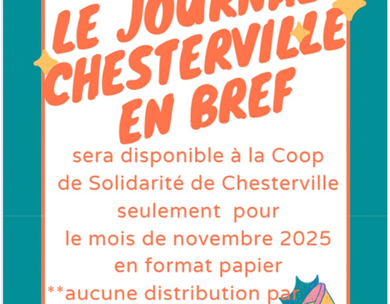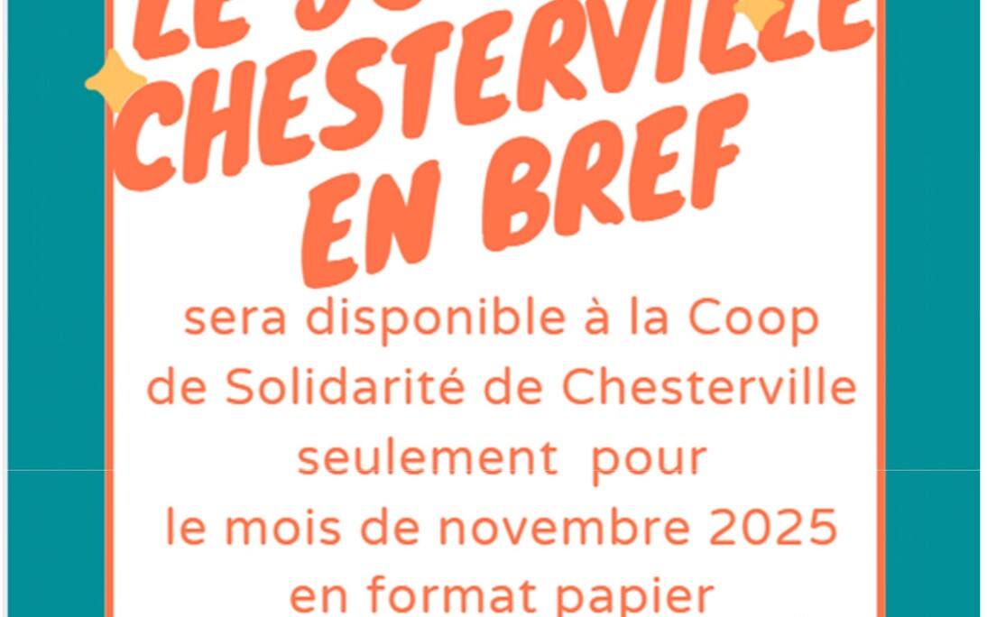 Journal Chesterville en bref sera disponible en version papier pour le mois de novembre 2025 à la Coop de Solidarité de Chesterville.